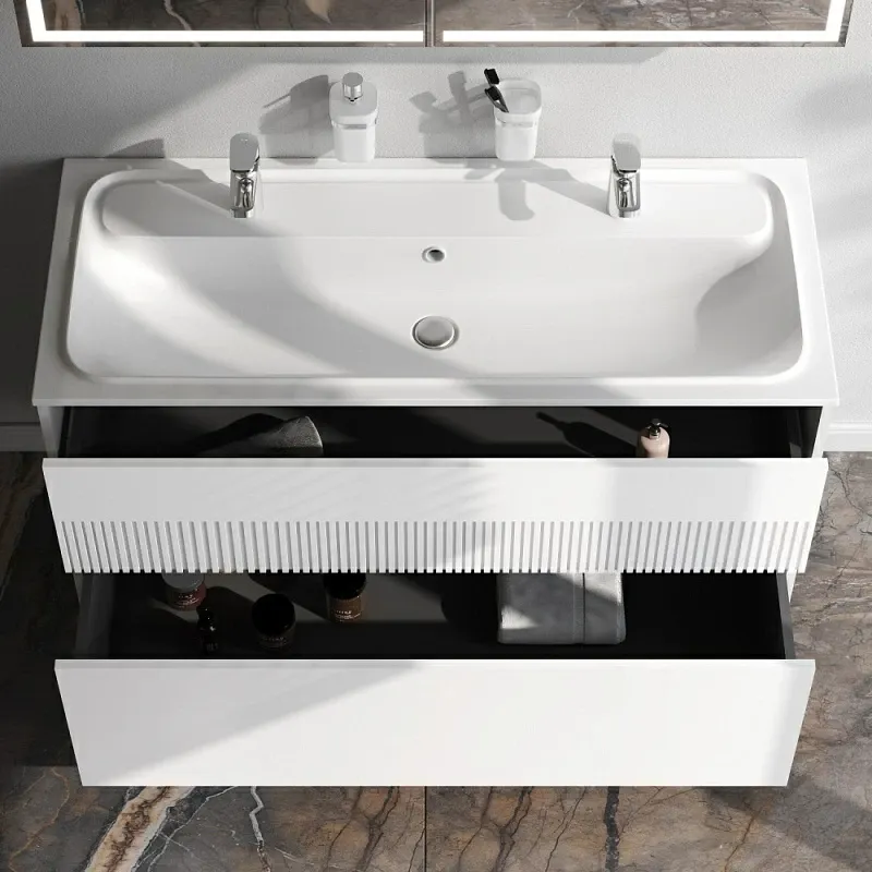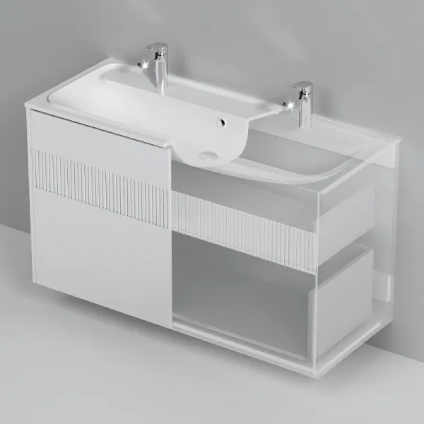 Дополните покупку тумбы уникальной широкой раковиной, интегрированной со столешницей. Раковина позволяет устанавливать два смесителя. Дизайн разработан немецкой студией Design3. Раковина выполнена из литьевого мрамора. Матовая поверхность раковины придает интерьеру ощущение уюта и комфорта. Размер раковины (Ш/Г/В): 1208x492x160 мм. Цвет раковины - белый.