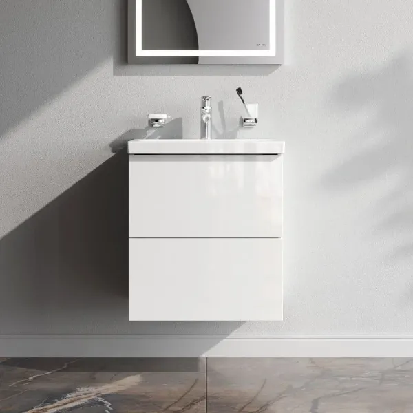 Тумба под раковину Am.Pm X-Joy M85AFSX06021WG напольная белый глянец 57.5 смТумба под раковину Am.Pm X-Joy 60 M85AFSX06021WG напольная белый глянцевый с отделкой под светлое дерево. 2 ящика (внутри в цвете антрацит с антискользящим эффектом). В верхнем ящике органайзер для хранения гигиенических принадлежностей. Раковина приобретается отдельно (см. дополнительную комплектацию). Комплектация: тумба под раковину, комплект ножек, инструкция
