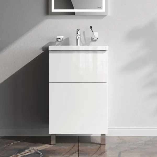 Тумба под раковину Am.Pm Gem M90FSX0502WG белый 50 смТумба под раковину Am.Pm Gem 50 M90FSX0502WG напольная, белый, глянец. 2 ящика (внутри в цвете антрацит с антискользящим эффектом). В верхнем ящике органайзер для хранения гигиенических принадлежностей. Фурнитура push-to-open - открытие ящика легким нажатием на фасад. Направляющие скрытого монтажа обеспечивают плавное выдвижение ящиков. Комплектация: тумба под раковину, комплект ножек, инструкция