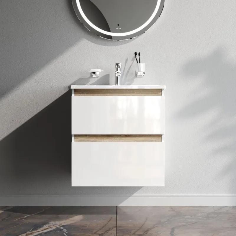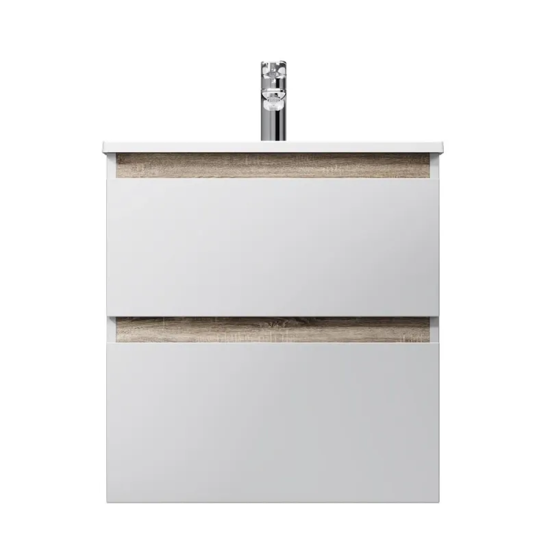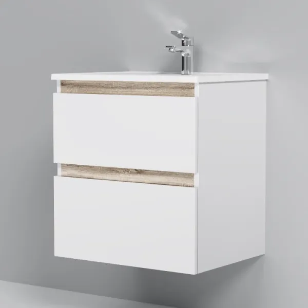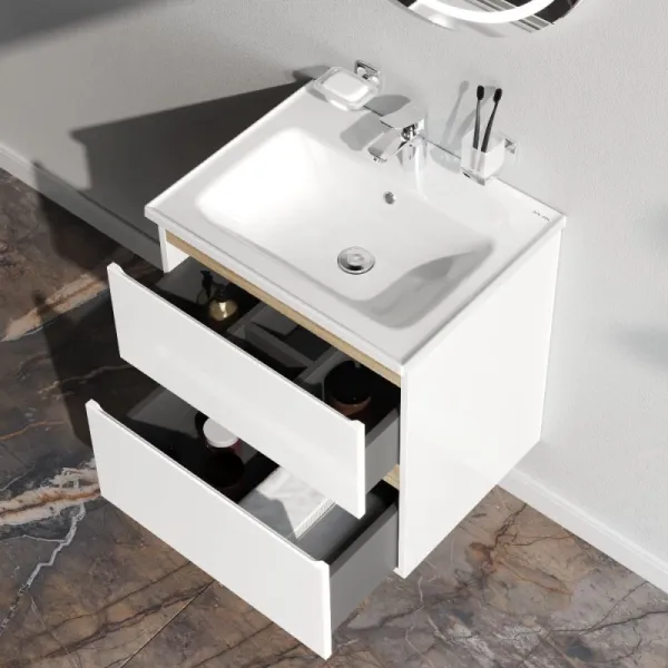Тумба под раковину Am.Pm X-Joy M85AFHX0602WG подвесная белый глянец 60 смТумба под раковину Am.Pm X-Joy 60 M85AFHX0602WG подвесная, белый глянцевый с отделкой под светлое дерево. 2 ящика (внутри в цвете антрацит с антискользящим эффектом). В верхнем ящике органайзер для хранения гигиенических принадлежностей. Раковина приобретается отдельно (см. дополнительную комплектацию). Комплектация: тумба под раковину, крепеж к стене, инструкция