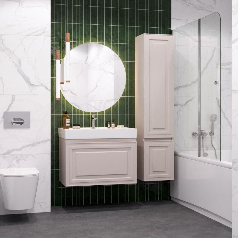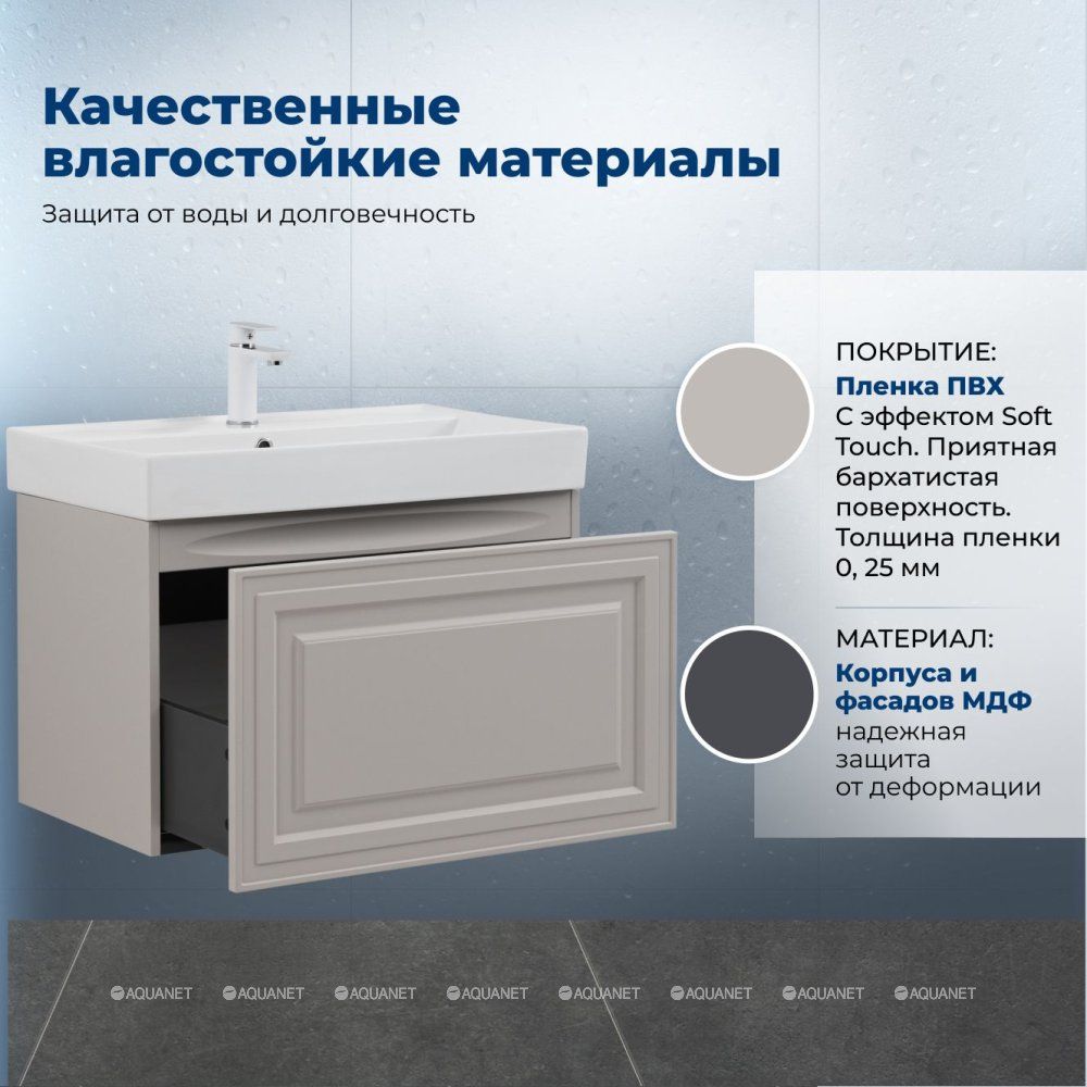 Тумба под раковину Aquanet Агата 75 бежевый — практичное и стильное решение для ванной комнаты. Корпус и фасады изготовлены из МДФ с покрытием пленкой ПВХ. Пленка имеет эффект Soft touch, создавая приятную бархатистую поверхность. Она устойчива к царапинам и влаге, сохраняя внешний вид надолго.