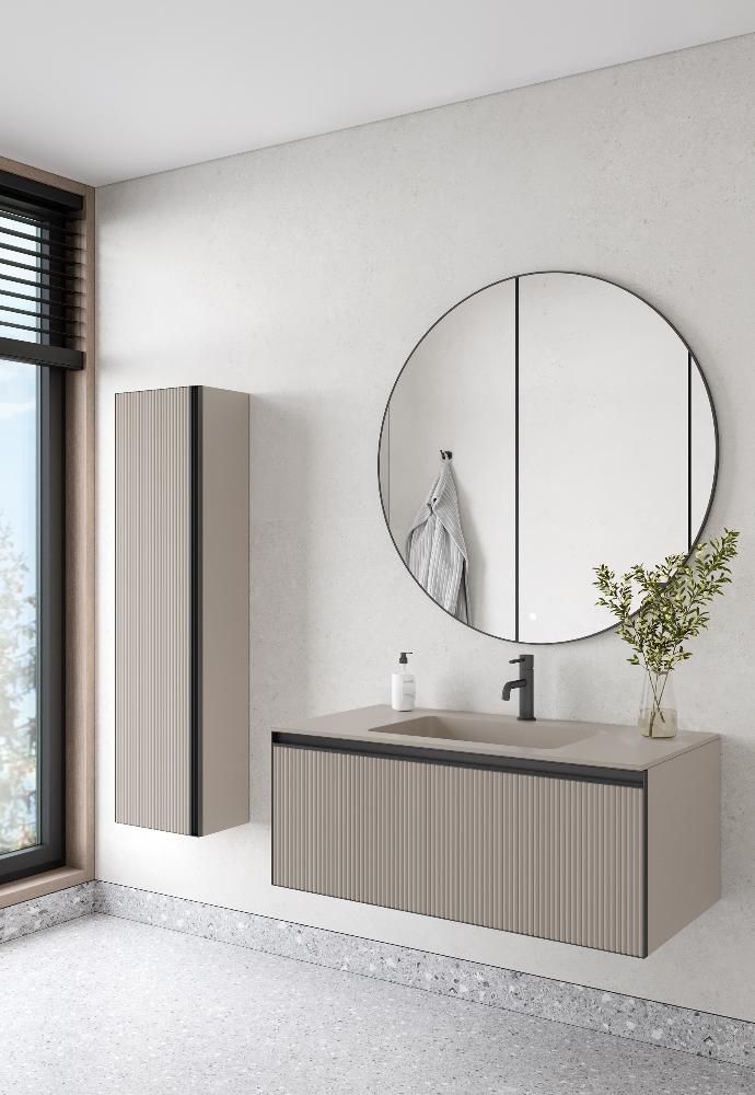 Главной особенностью коллекции являются обрамления фасадов из алюминия в самых трендовых цветах: графит, матовое золото, матовый черный и серебро. Эти обрамления идеально дополняют сантехнику в ванной комнате.