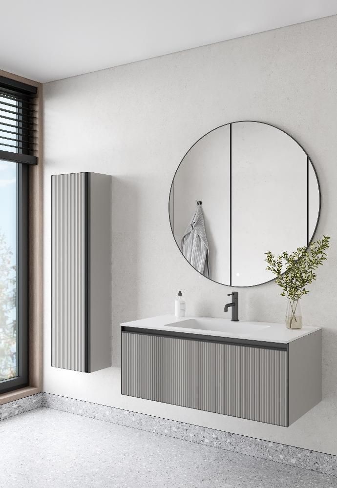 Главной особенностью коллекции являются обрамления фасадов из алюминия в самых трендовых цветах: графит, матовое золото, матовый черный и серебро. Эти обрамления идеально дополняют сантехнику в ванной комнате.