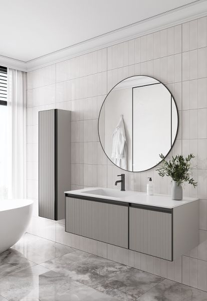 Главной особенностью коллекции являются обрамления фасадов из алюминия в самых трендовых цветах: графит, матовое золото, матовый черный и серебро. Эти обрамления идеально дополняют сантехнику в ванной комнате.