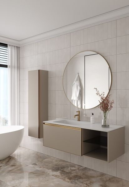 Главной особенностью коллекции являются обрамления фасадов из алюминия в самых трендовых цветах: графит, матовое золото, матовый черный и серебро. Эти обрамления идеально дополняют сантехнику в ванной комнате.