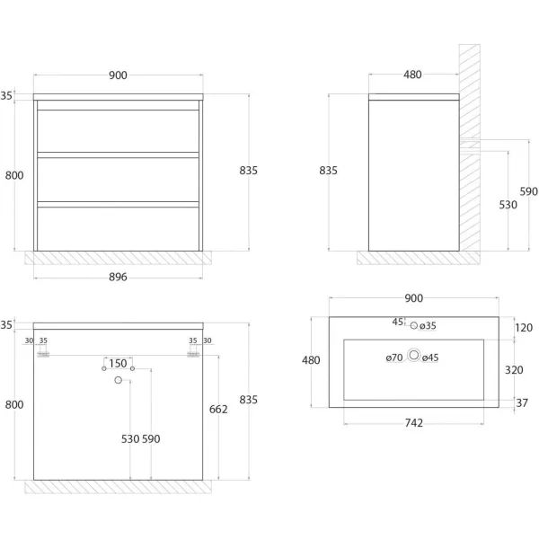 FAMILY База под раковину напольная с тремя выкатными ящиками, Pino Bianco, 900x480x845, FAMILY-9... Подробнее