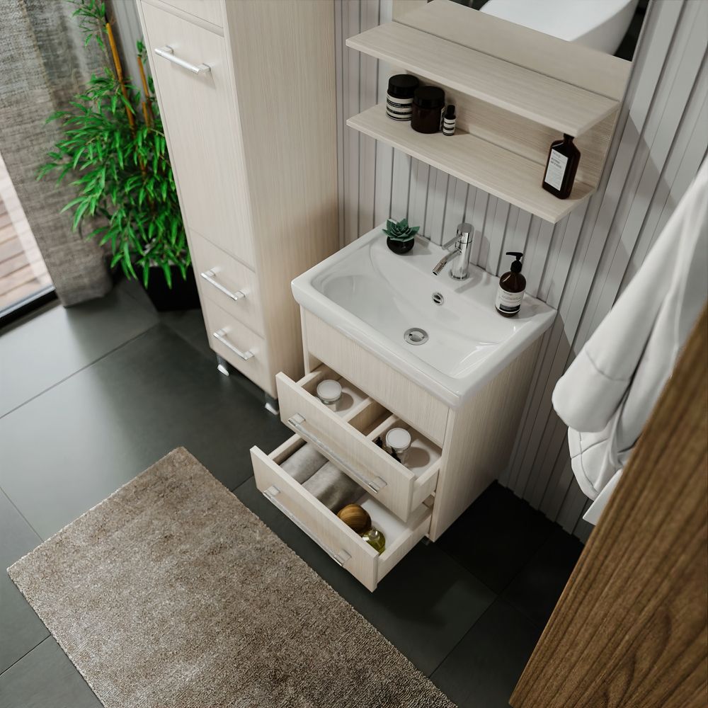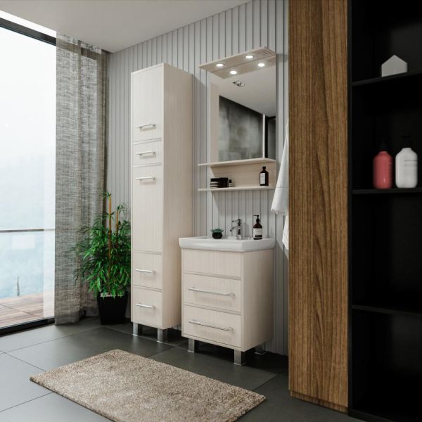 Удобная система хранения позволяет размещать все необходимое для гигиенических процедур, а её продуманные размеры отлично вписываются даже в небольшие помещения. Стильные ручки и элегантные фасады придают тумбе особый шарм, а разнообразие цветовых решений позволит выбрать модель, соответствующую любому интерьеру – от классического до модерн.