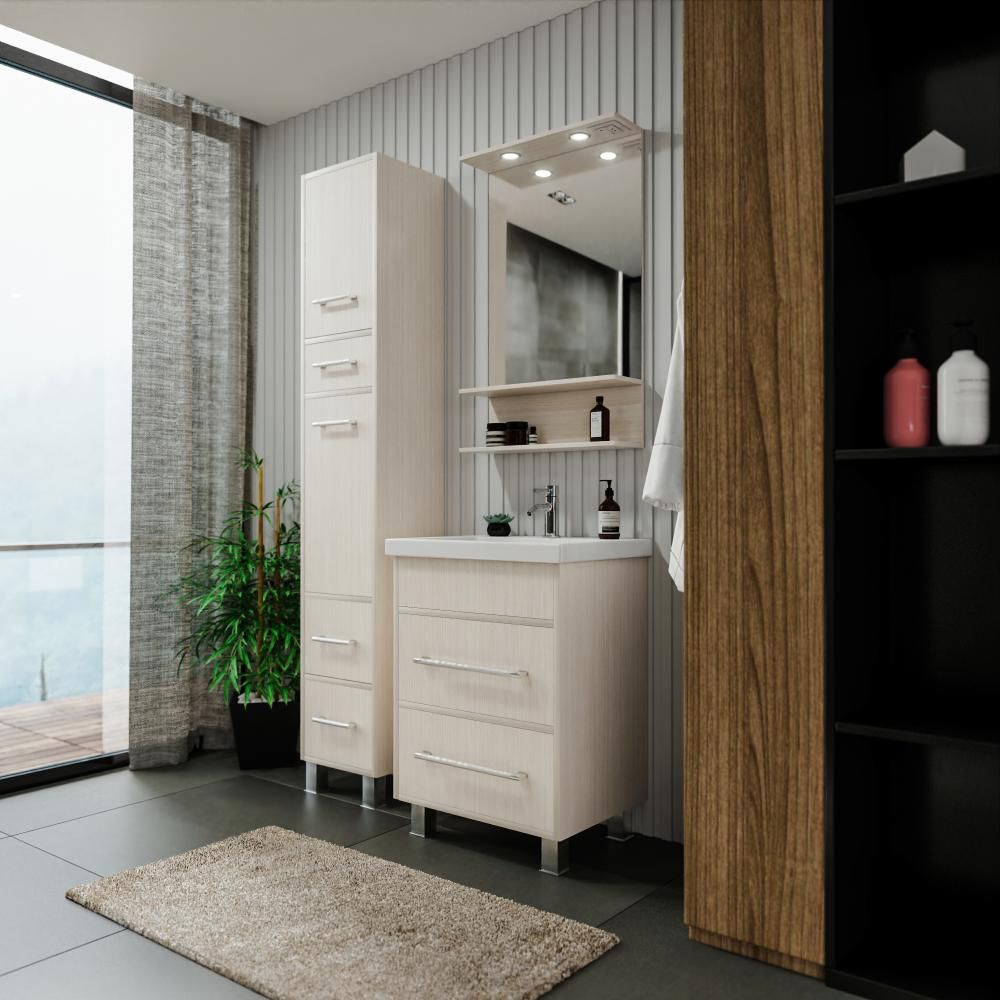 Удобная система хранения позволяет размещать все необходимое для гигиенических процедур, а её продуманные размеры отлично вписываются даже в небольшие помещения. Стильные ручки и элегантные фасады придают тумбе особый шарм, а разнообразие цветовых решений позволит выбрать модель, соответствующую любому интерьеру – от классического до модерн.