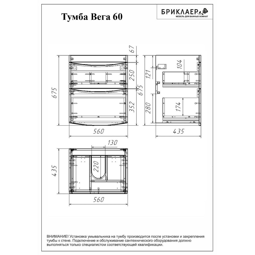 Тумба под раковину Бриклаер Вега 4627125415739 с двумя ящиками 60 см белый купить