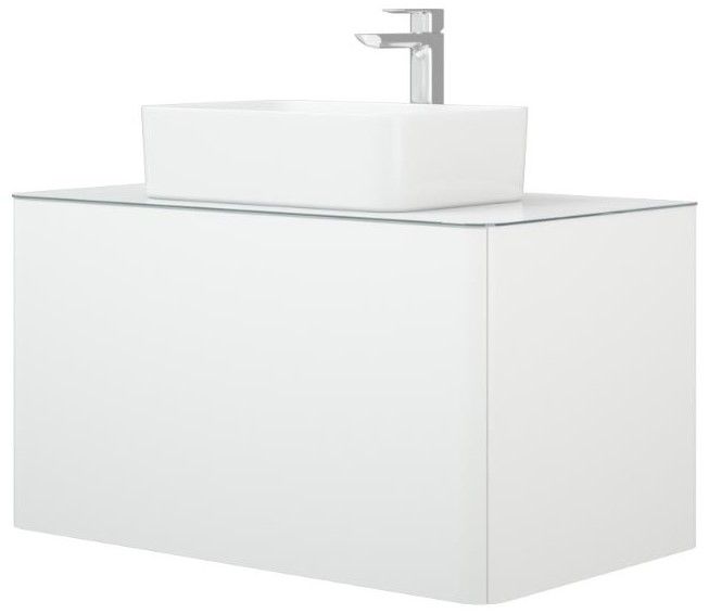 Подвесная тумба "Рино 90" оснащена 1 выдвижным ящиком на направляющих "push to open". Высота ящика - 85 мм. Внутри располагается ещё один ящик высотой 85 мм. Для открывания нужно нажать на фасад ящика. Все ящики имеют выпилы под коммуникации. Сверху на крышке есть стеклянная крашенная столешница. Есть вырезы для коммуникаций раковин в столшнице. Фасады, боковины - МДФ в плёнке. Есть подвесы для крепления к стене. Столешница тумбы изготовлена из высококачественного и очень прочного стекла "Лакобель". Раковина может быть выбрана на любой вкус. Классический вариант для комплектования тумбы "Рино 90" - раковина "Олимпия 56".