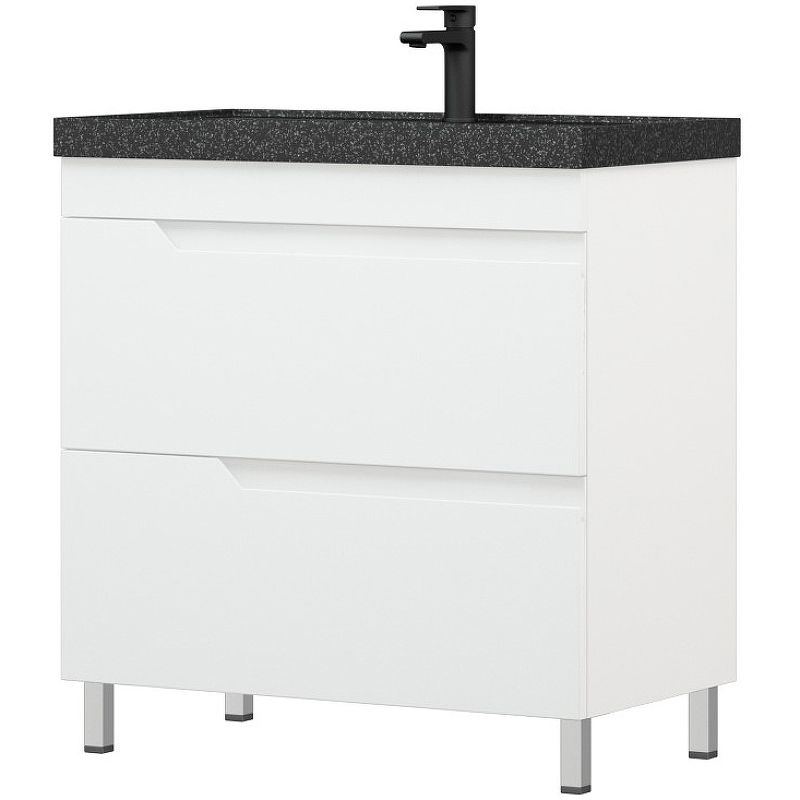 Тумба Юрма оснащена двумя выдвижными ящиками. Ящики на направляющих скрытого монтажа 350 мм с доводчиками. Фасады без ручек - есть специально сделанная фрезеровка для открывания. Верхний ящик высотой 135 мм с выпилом под коммуникации, нижний высотой 135 мм. 4 хромированные опоры на 100 мм. Фасадная часть и боковины покрашены в глянцевую белую эмаль. Увеличенная толщина фасада до 19 мм. Корпус - ЛДСП 16 мм белый.Характеристики:Цвет: белый.