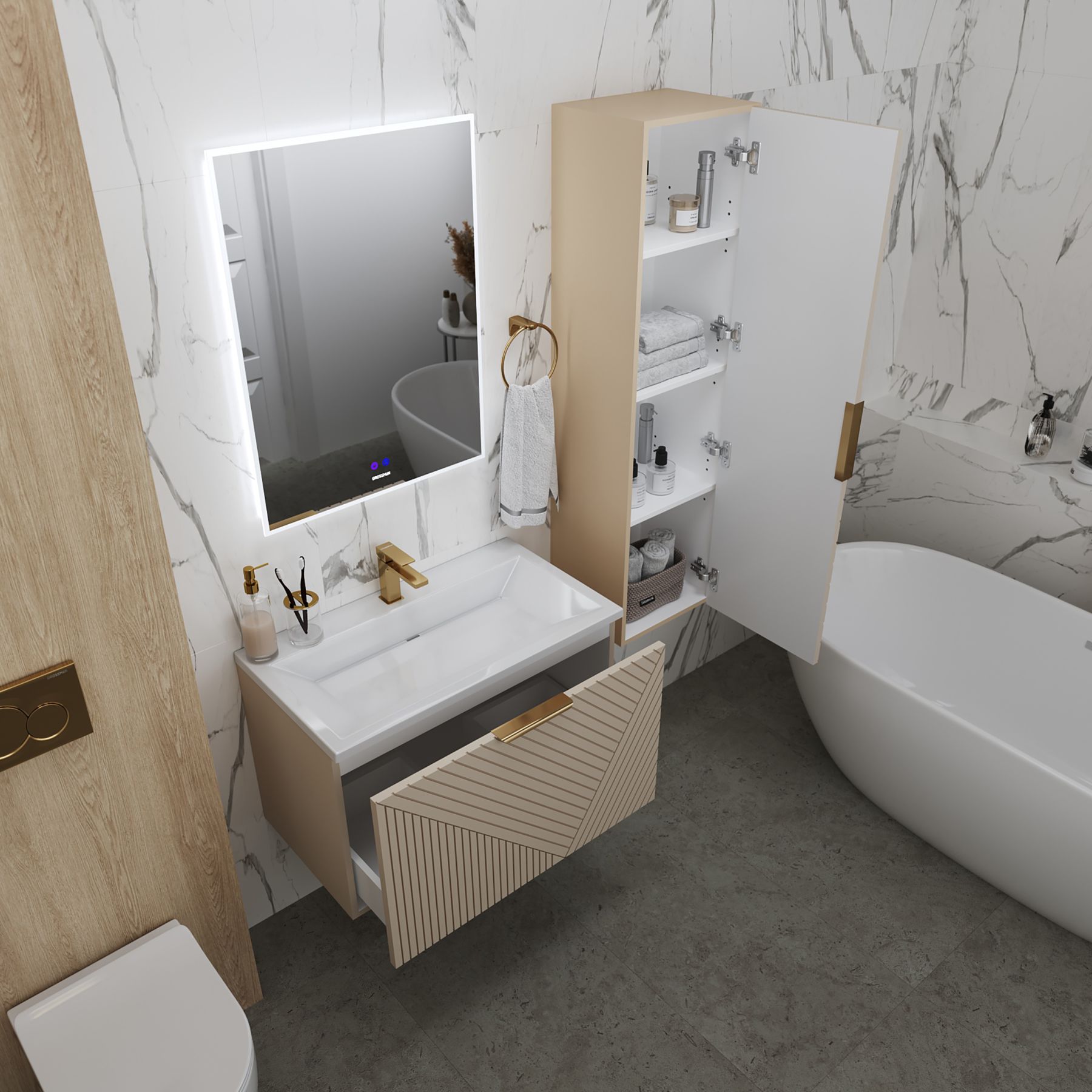 Материалы, используемые в тумбе, обеспечивают повышенную влагостойкость, что особенно важно для использования в ванной комнате. Покрытие защищает от разбухания и деформации при попадании воды.