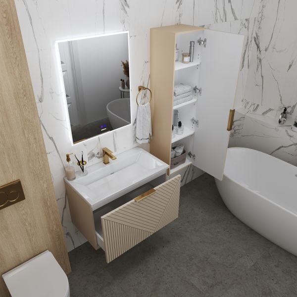 Корпус и фасады выполнены из влагостойкого МДФ, покрытого высококачественной матовой краской. Это гарантирует устойчивость к влаге и долговечность при ежедневном использовании в условиях повышенной влажности.Размеры: