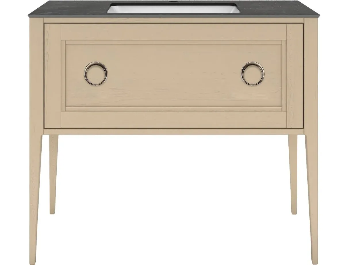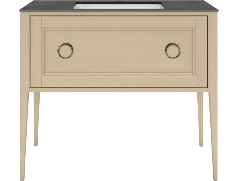 Напольная тумба с одним выдвижным и одним внутренним ящиками выполнена из массива ясеня с отделкой «открытая пора». Вместительный ящик с плавным закрыванием украшен двумя крупными ручками. Сочетается с керамическими столешницами PLAZA Classic шириной 100 см. Подходит для установки раковин с типом монтажа «накладная на столешницу» и «встраиваемая сверху».