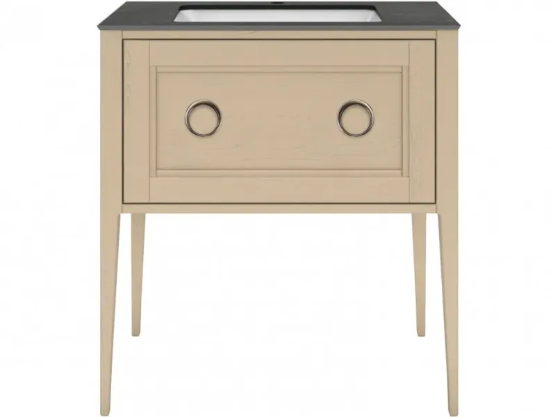 Напольная тумба с одним выдвижным и одним внутренним ящиками выполнена из массива ясеня с отделкой «открытая пора». Вместительный ящик с плавным закрыванием украшен двумя крупными ручками. Сочетается с керамическими столешницами PLAZA Classic шириной 80 см. Подходит для установки раковин с типом монтажа «накладная на столешницу» и «встраиваемая сверху».