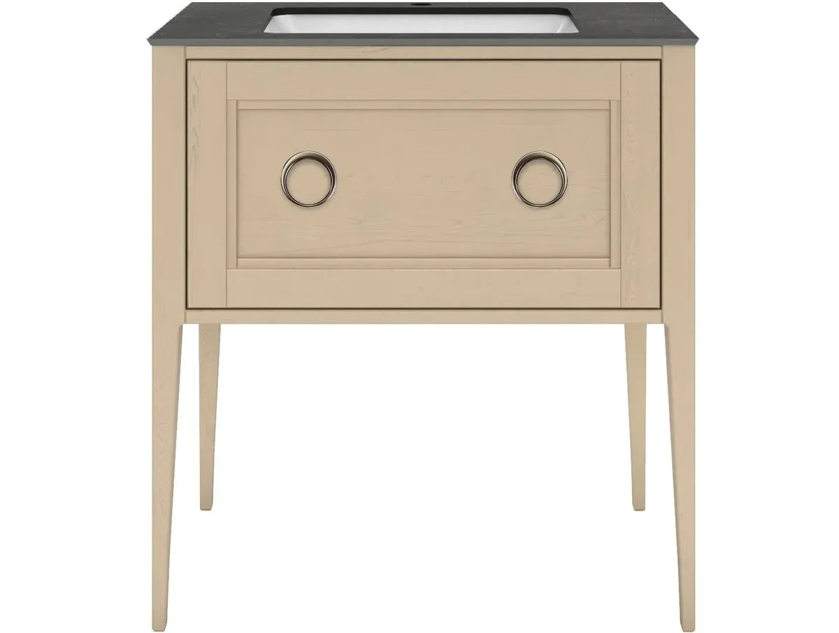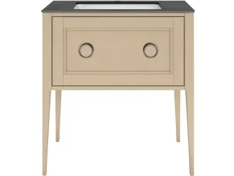 Напольная тумба с одним выдвижным ящиком выполнена из массива ясеня с отделкой «открытая пора». Вместительный ящик с плавным закрыванием украшен двумя крупными ручками. Сочетается с керамическими столешницами PLAZA Classic шириной 80 см. Подходит для установки раковин с типом монтажа «встраиваемая снизу».