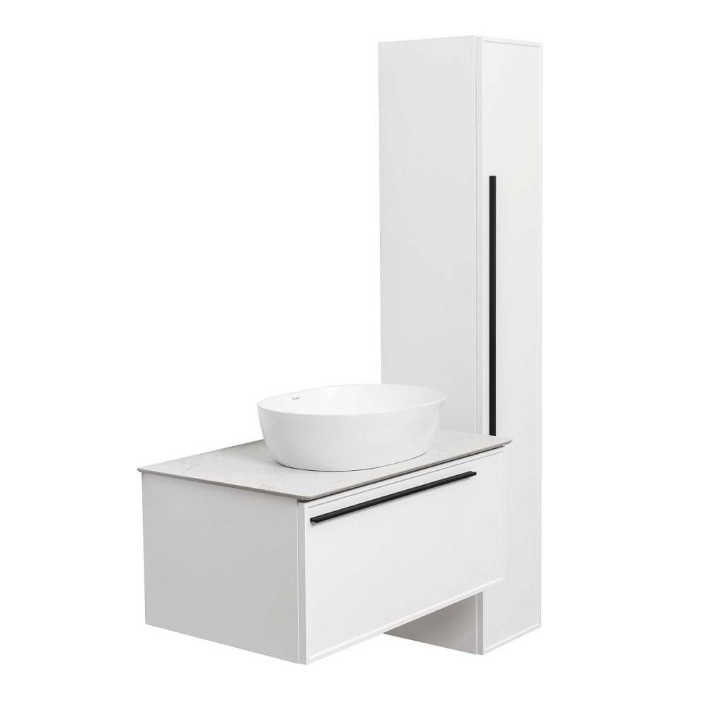Тумба под раковину La Fenice Cubo FNC-01-ELB-B-80 77.6 смПодвесная тумба La Fenice Cubo FNC-01-CUB-G-100 обладает рядом неоспоримых преимуществ. Тумбу можно оснастить встраиваемой раковиной (арт.CU.NN.100), либо же приобрести столешницу в подходящем цветовом решении (арт. FNC-03-PL01-100, FNC-03-VS03-100) и установить на неё раковину-чашу. К данной тумбе необходимо выбрать один из трех цветов ручки (FNC-04-CUB-B-168 - белая; FNC-04-CUB-N-168 - черная; FNC-04-CUB-C-168 - хром), ручка включена в стоимость тумбы. За счет входящего в комплект сифона Prevex, тумба обладает полноценным ящиком для хранения (без выреза). Ящик выполнен в фантазийной цветовой гамме "Лён антрацит". Тумба оснащена скрытыми доводчиками плавного закрывания частичного выдвижения Samet (Турция) и подвесным регулируемым механизмом Camar (Италия). Фасад и корпус тумбы покрыты краской и матовым лаком, что является надёжной защитой от влаги. Прекрасным и функциональным дополнением к тумбе станет пенал La Fenice Cubo серо-зеленого цвета FNC-05-CUB-G-30