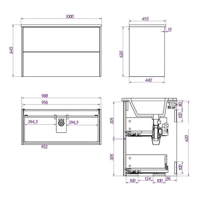 Габариты корпуса тумбы (ШхВхГ): 988х620х440 мм.