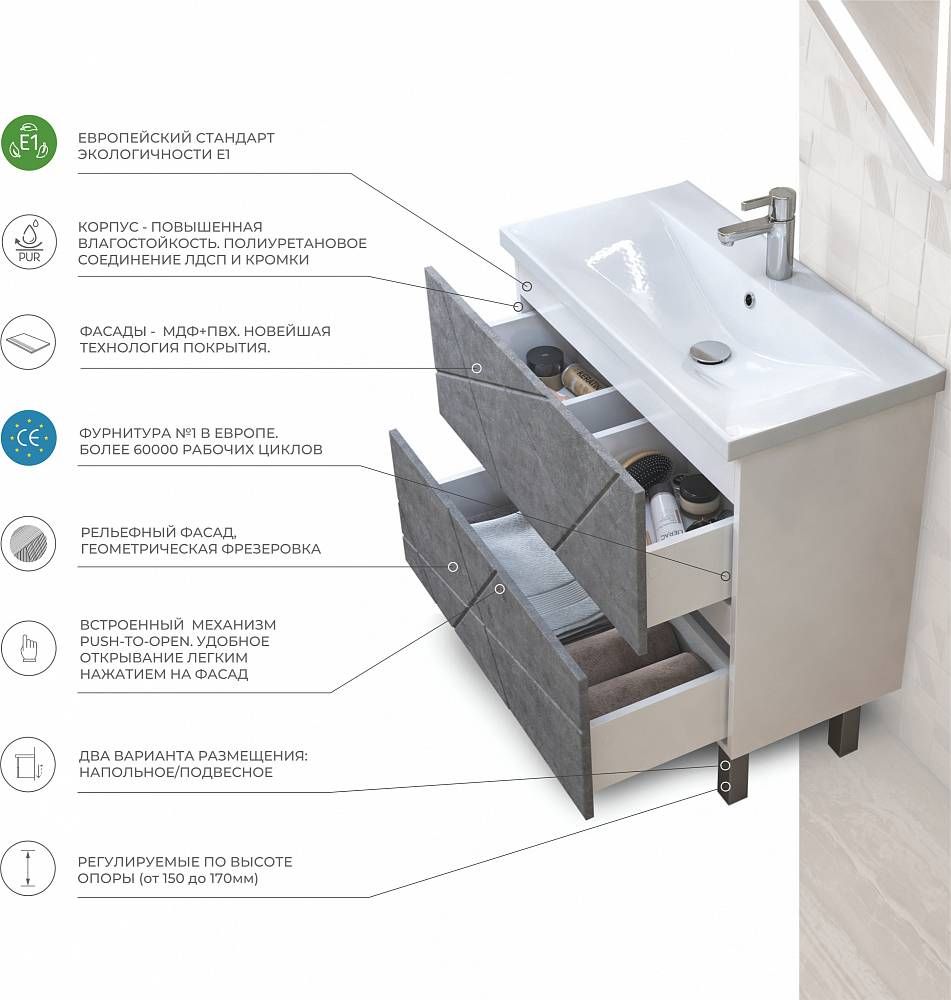 Напольная тумба. 2 ящика; опоры квадратные регулируемые.Специальный сифон Vigo в комплекте. Материл корпуса тумбы: влагостойкая ЛДСПМатериал фасадов: МДФПокрытие: пленка ПВХЯщики: направляющие полного выдвижения, механизм push-to-open