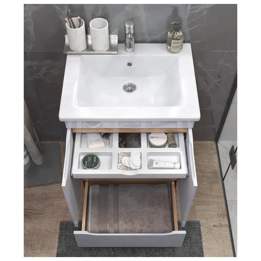 Тумбы Grani оснащены удобным органайзером, который позволяет легко находить и доставать необходимые вещи. Мебель оснащена шариковыми направляющими полного выдвижения, что обеспечивает плавный и бесшумный ход ящика. Еще более комфортное использование мебели делают интегрированные ручки и дверные петли с доводчиком.