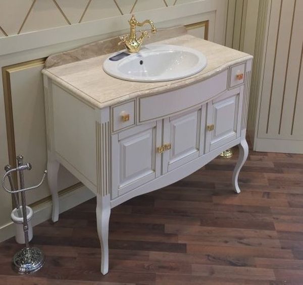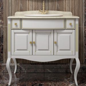 Тумба под раковину Opadiris Лаура 100 Z0000007090 под мраморную столешницу. Цвет: белый матовый с золотой патиной.Выполнена в классическом стиле с плавными изогнутыми формами и изящными гнутыми ножками. Фасадные элементы украшены резными узорами. Особую роскошь добавляют ручки инкрустированные кристаллами Swarovski.Материал фасада/корпуса: массив бука/влагозащищенный МДФ.