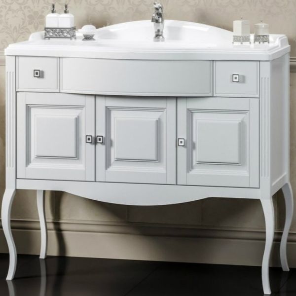 Выполнена в классическом стиле с плавными изогнутыми формами и изящными гнутыми ножками. Фасадные элементы украшены резными узорами. Особую роскошь добавляют ручки инкрустированные кристаллами Swarovski.Материал фасада/корпуса: массив бука/влагозащищенный МДФ.