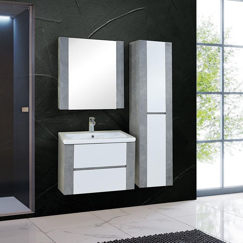 Подвесная тумба Стоун 70 отражает актуальные тенденции в дизайне мебели для ванной комнаты: минимализм и геометрия фасадов, чёткость и лаконичность форм, отсутствие декора и стильный цвет выбеленного бетонного покрытия.