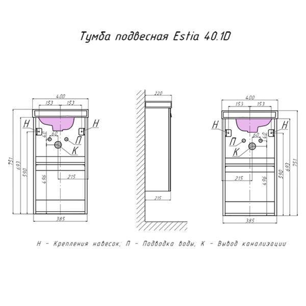 Тумба под раковину подвесная Velvex Estea tp.EST.MOD.40.1D, 40 см