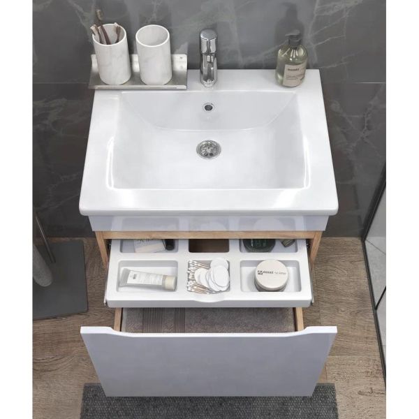Тумбы Grani оснащены удобным органайзером, который позволяет легко находить и доставать необходимые вещи. Мебель оснащена шариковыми направляющими полного выдвижения, что обеспечивает плавный и бесшумный ход ящика. Еще более комфортное использование мебели делают интегрированные ручки и дверные петли с доводчиком.