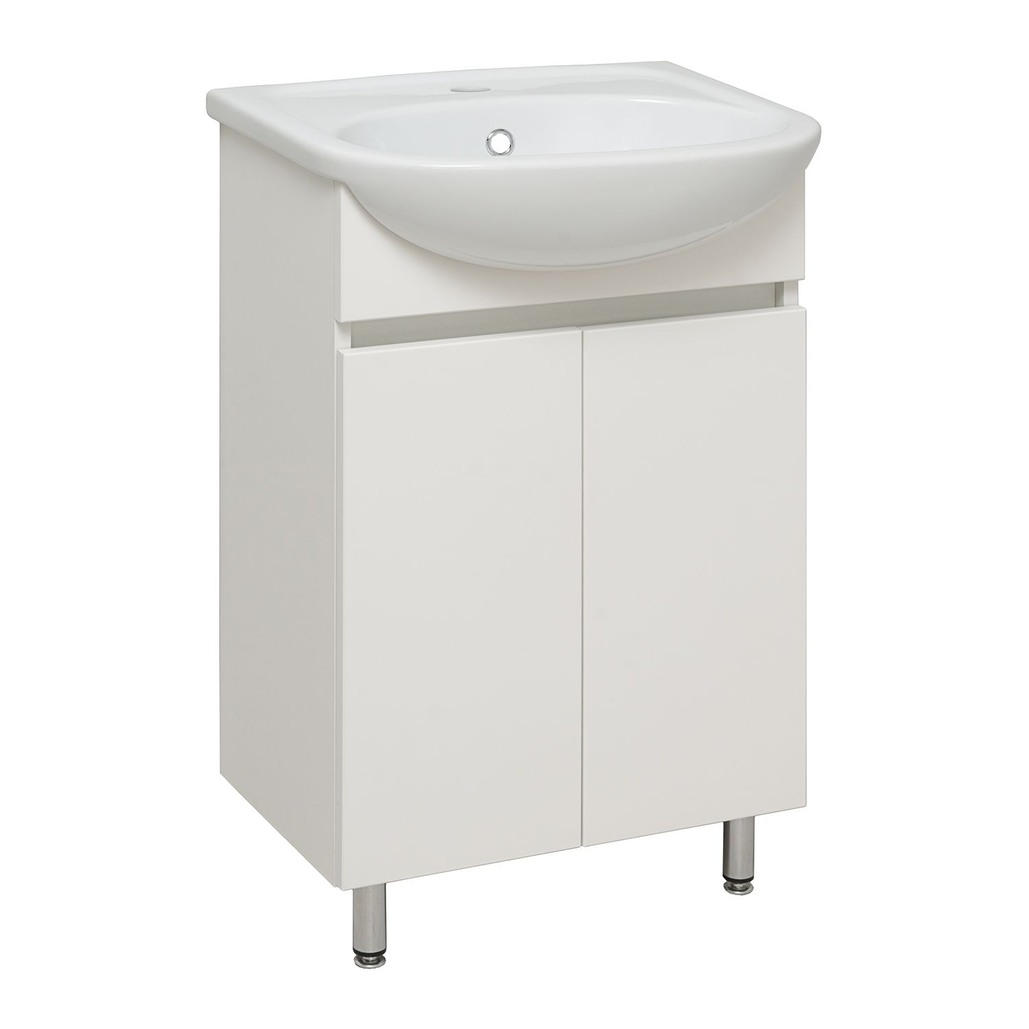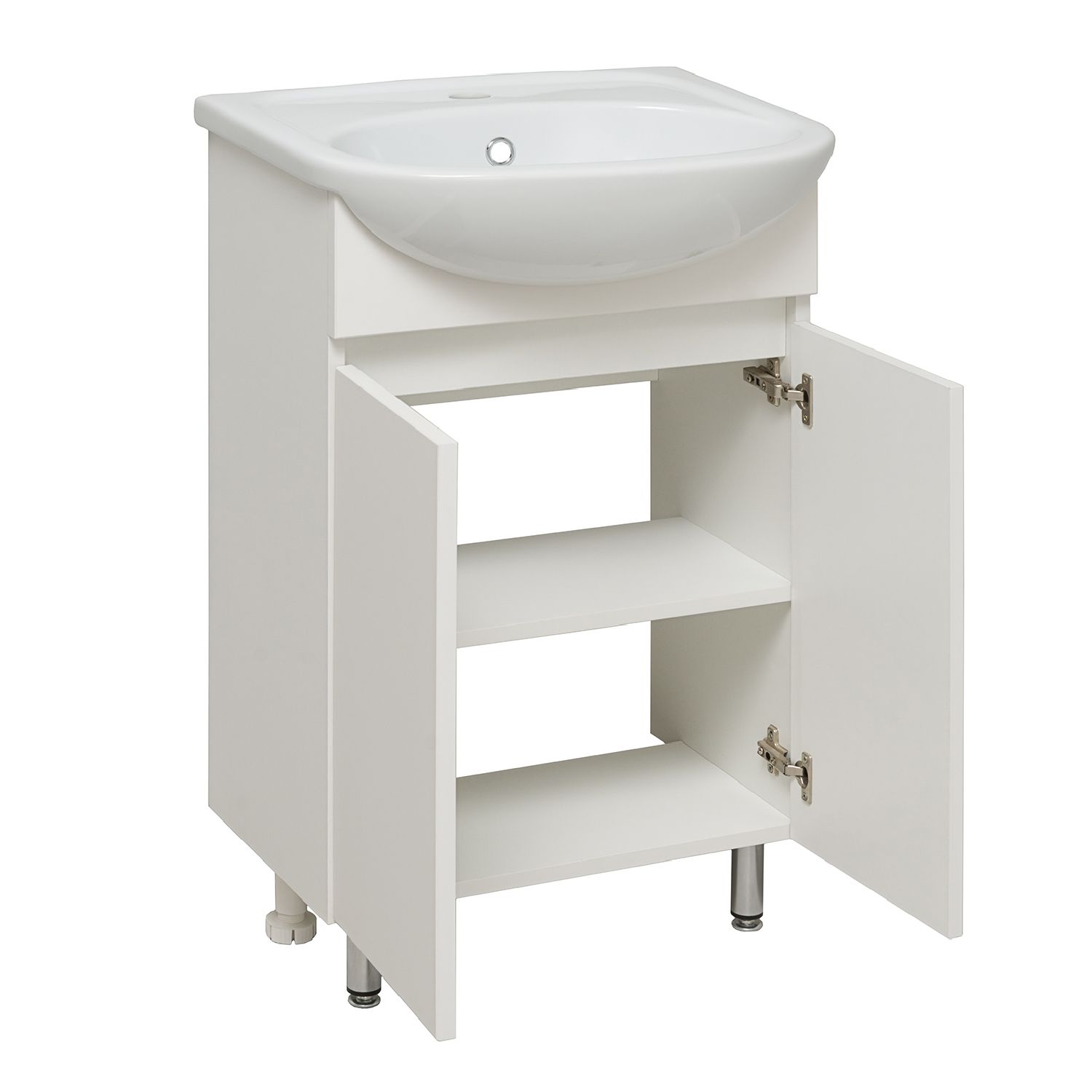Тумба с раковиной RUNO ЛАДА - модное и оригинальное решение для бюджетного оснащения ванной комнаты. Тумба под раковину ЛАДА (напольная) выполнена в двух цветах - классическом белом и в стильном цвете - графит/серый дуб . Тумба в ванную имеет две распашные дверцы и одну внутреннюю полку. В комплекте идут петли со встроенным доводчиком, 2 хромированные и 2 пластиковые ножки. Тумба для ванной комплектуется керамической раковиной "Уют" (500*420 мм). Раковина имеет глубину 18 см. Мебель для ванной RUNO - красота и практичность в мелочах!