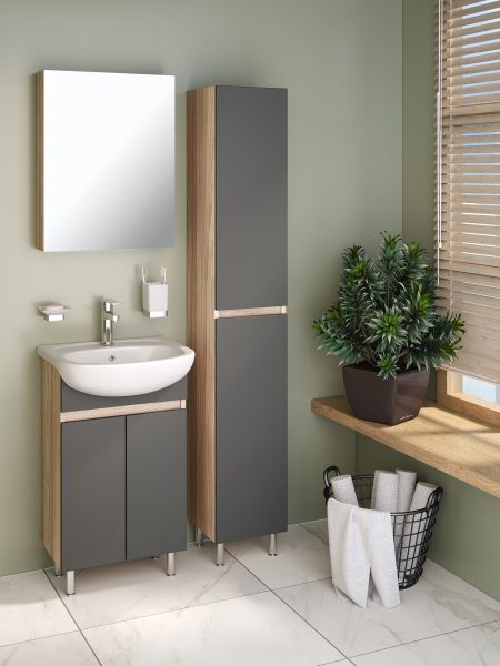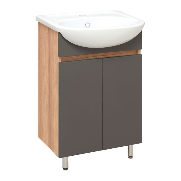 Тумба с раковиной RUNO ЛАДА - модное и оригинальное решение для бюджетного оснащения ванной комнаты. Тумба под раковину ЛАДА (напольная) выполнена в двух цветах - классическом белом и в стильном цвете - графит/серый дуб . Тумба в ванную имеет две распашные дверцы и одну внутреннюю полку. В комплекте идут петли со встроенным доводчиком, 2 хромированные и 2 пластиковые ножки. Тумба для ванной комплектуется керамической раковиной "Уют" (500*420 мм). Раковина имеет глубину 18 см. Мебель для ванной RUNO - красота и практичность в мелочах!
