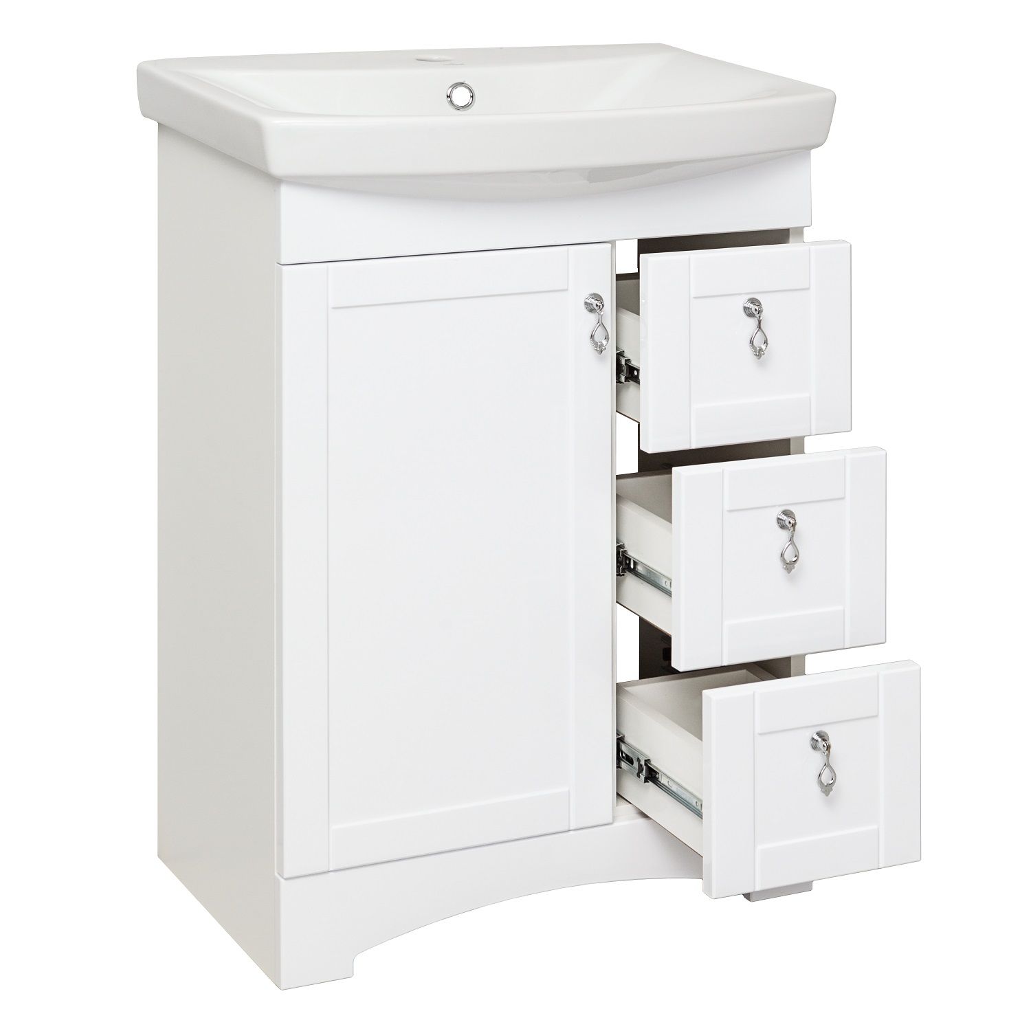 Коллекция мебели «Мерида» выполнена в классическом стиле. Четкие, лаконичные формы и продуманный функционал помогут украсить интерьер любой ванной комнаты. Тумба напольная с одним распашным фасадом и тремя выдвижными ящиками. За левой дверкой - одна внутренняя полка. Ящики - на шариковых направляющих полного выдвижения, петли со встроенным доводчиком, ручки - 4шт, ножки пластик - 4шт (скрыты за нижней фальш-панелью)