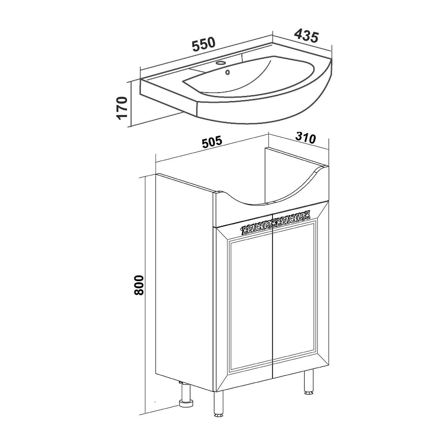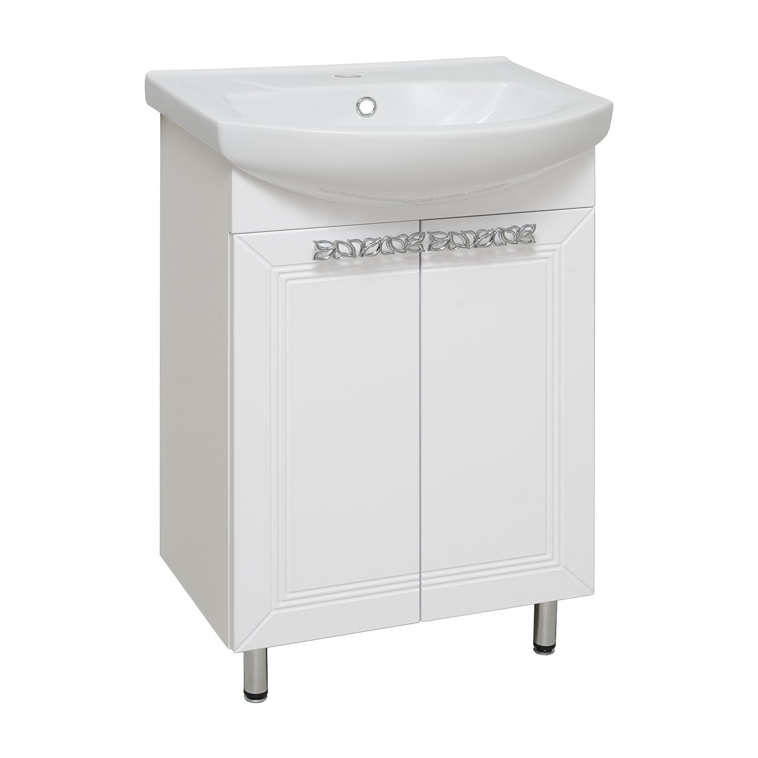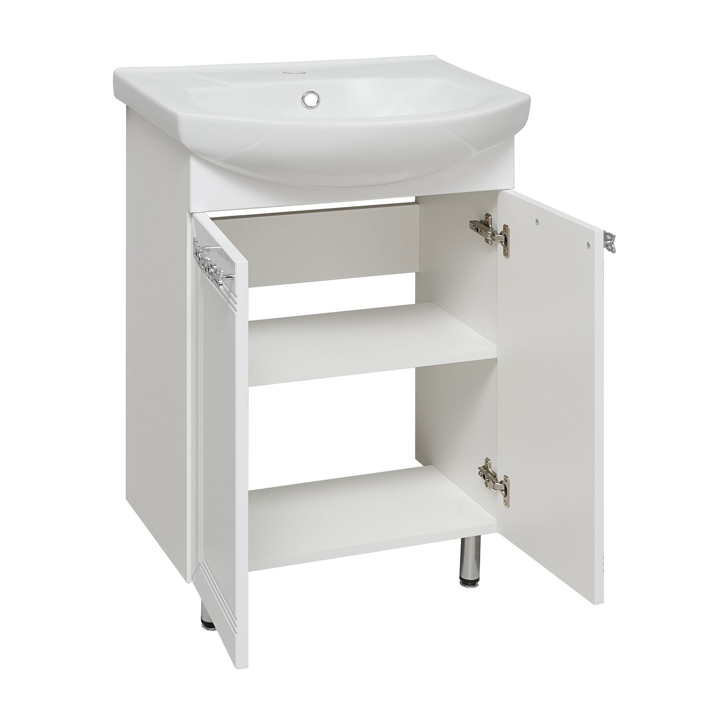 Тумба под умывальник напольная с двумя распашными дверками и одной внутренней полкой. Петли со встроенным доводчиком, ручки - 2шт, ножки хром - 2шт, ножки пластик -2шт.