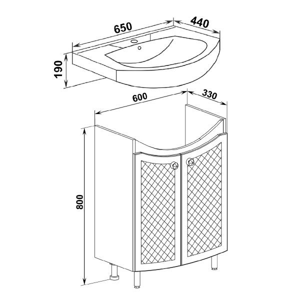 Тумба под умывальник напольная с двумя распашными дверками и одной внутренней полкой. Петли со встроенным доводчиком, ручки - 2шт, ножки хром - 2шт, ножки пластик -2шт.