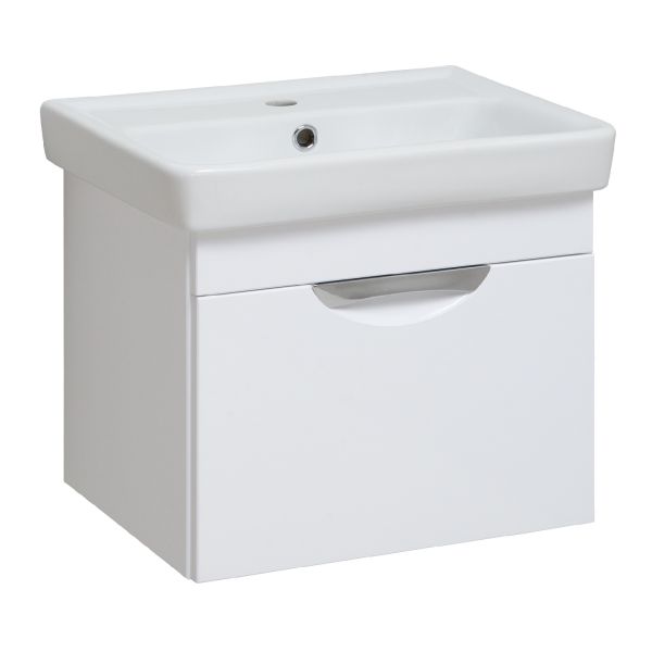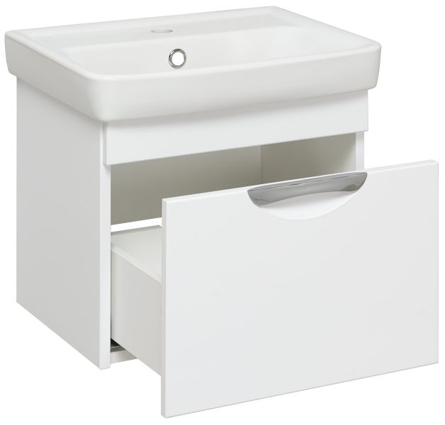 Тумба под умывальник подвесная с одним выдвижным ящиком. Ящик - на шариковых направляющих скрытого монтажа с доводчиком. Ручка врезная - 1шт , навесы -2шт.