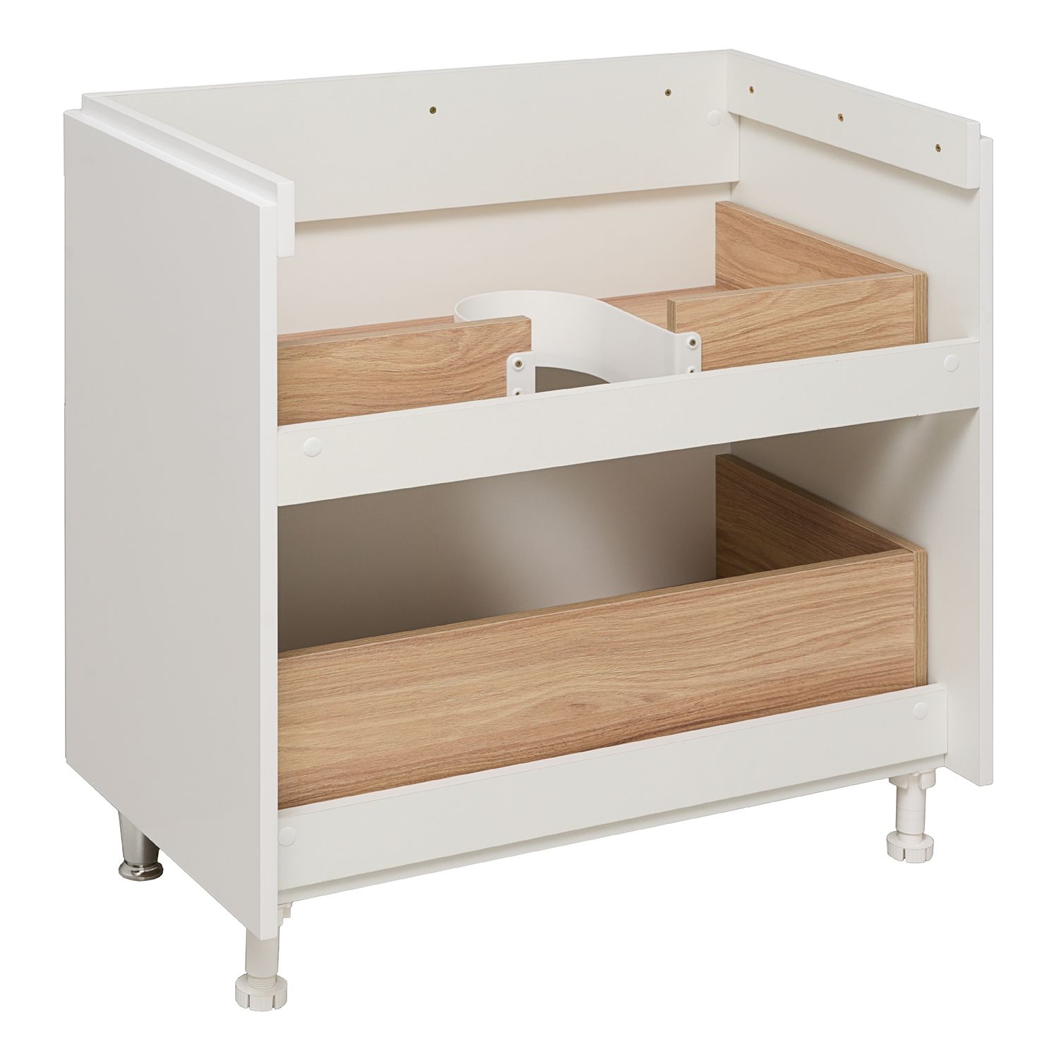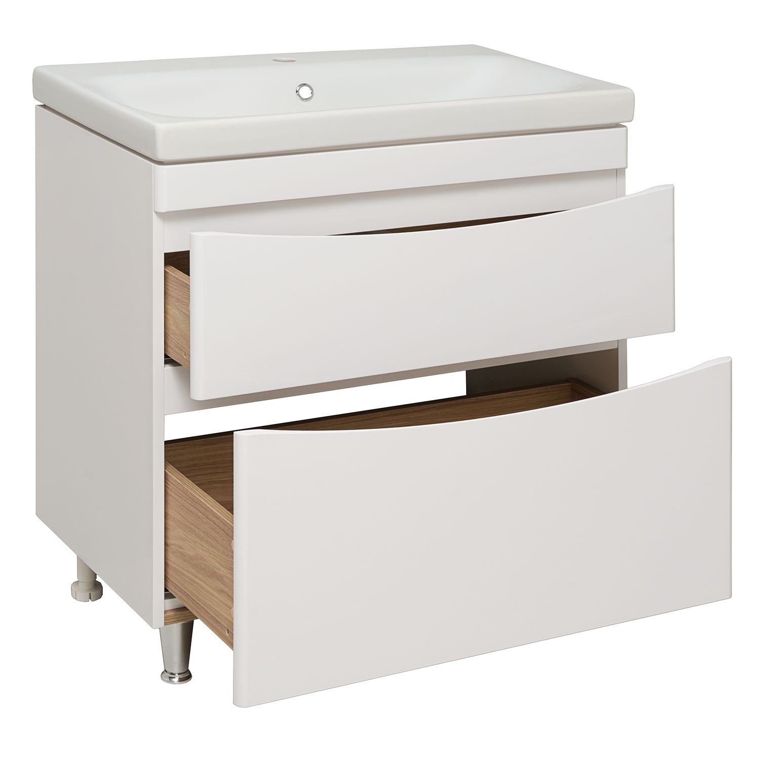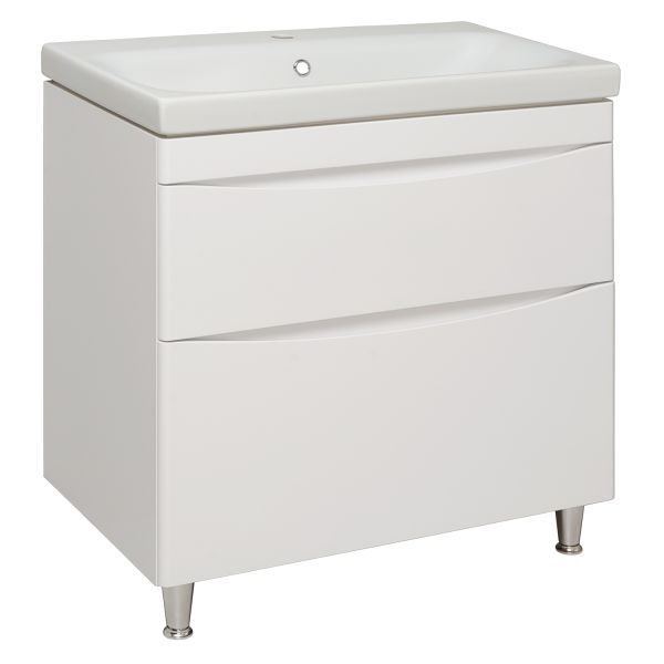 Тумба под раковину для ванной комнаты RUNO АФИНА - безупречное сочетание модных тенденций с классическим оформлением ванной комнаты. Тумба под раковину в ванную АФИНА имеет два выдвижных ящика на шариковых направляющих, оснащенных системой плавного закрывания. Цвет фасада универсальный - белый, идеально впишется в любой интерьер ванной комнаты. В комплекте идут 2 хромированные и 2 пластиковые ножки. К тумбе для ванной комнаты подходит накладная керамическая раковина "Moduo" (605х460 мм). Раковина имеет глубину 17,5 см. Мебель для ванной RUNO - красота и практичность в мелочах!