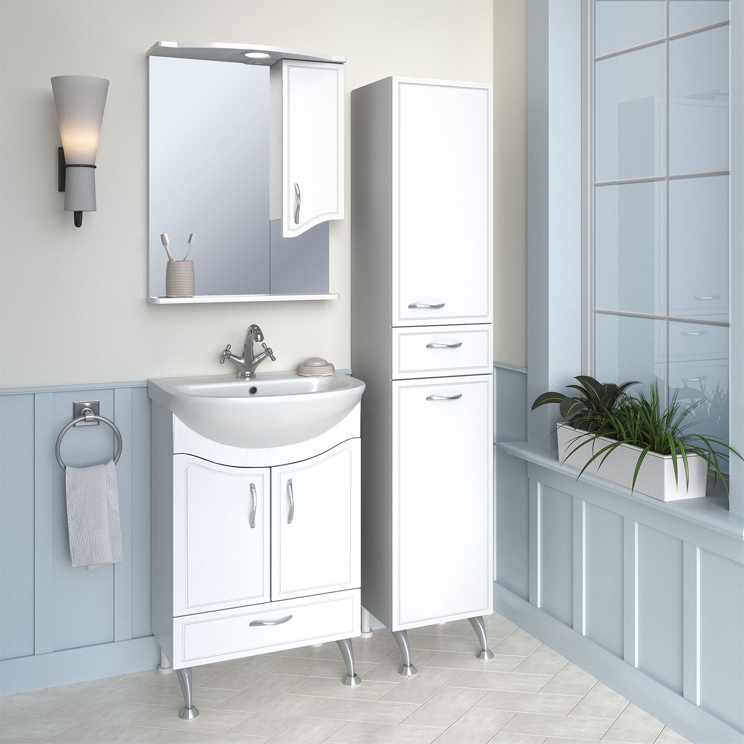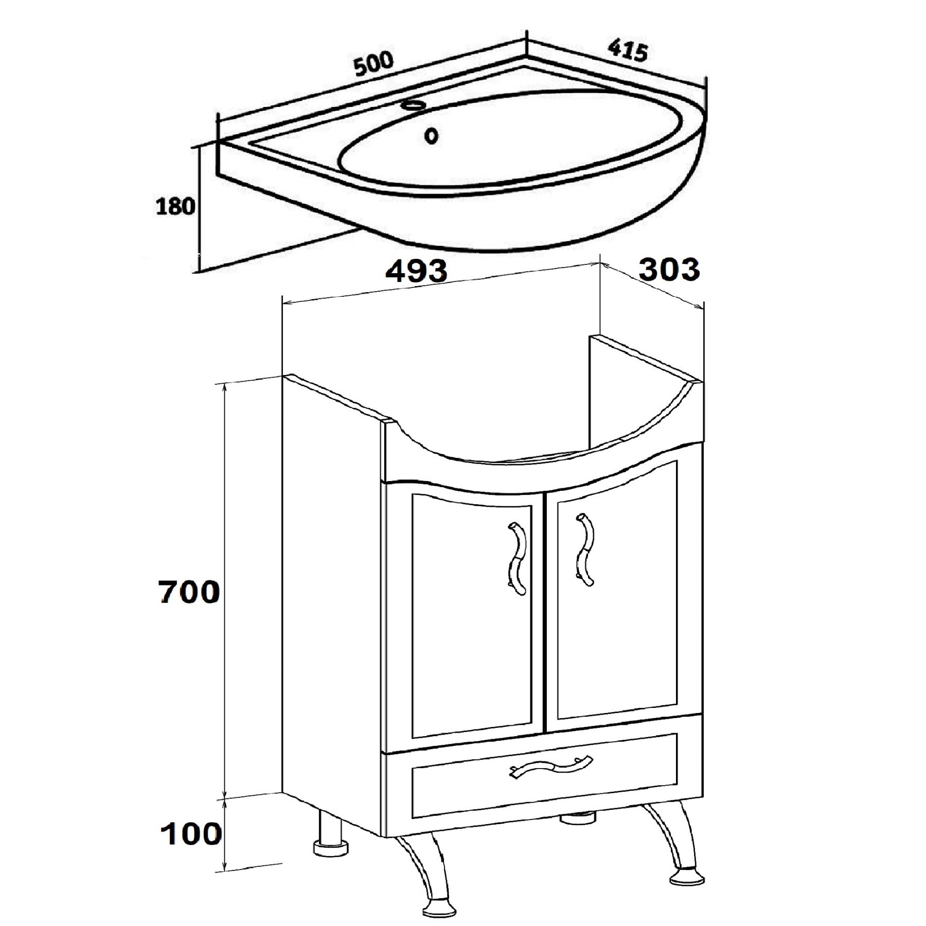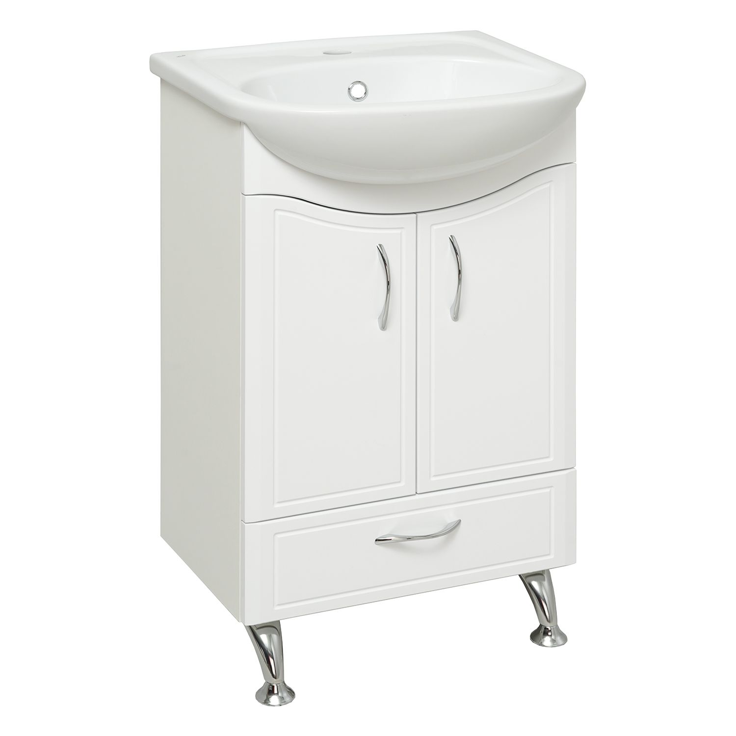 Тумба под умывальник напольная с двумя распашными фасадами и нижним выдвижным ящиком. За фасадами - одна встроенная полка. Петли со встроенным доводчиком, ящик - на шариковых направляющих, ручки - 3шт, ножки хром - 2шт, ножки пластик -2шт.