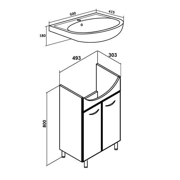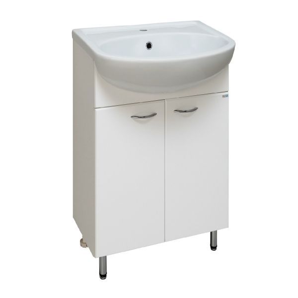 Тумба под умывальник напольная с двумя распашными фасадами и одной внутренней полкой. Петли со встроенным доводчиком, ручки - 2шт, ножки хром - 2шт, ножки пластик -2шт.