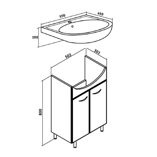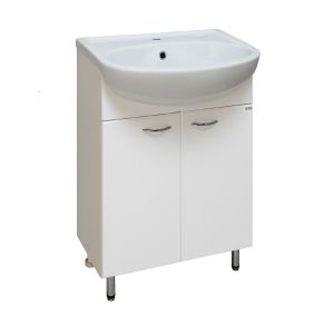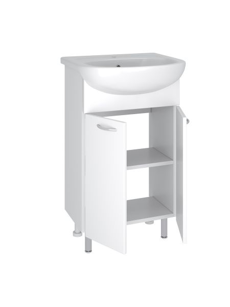 Тумба под умывальник напольная с двумя распашными фасадами и одной внутренней полкой. Петли со встроенным доводчиком, ручки - 2шт, ножки хром - 2шт, ножки пластик -2шт.