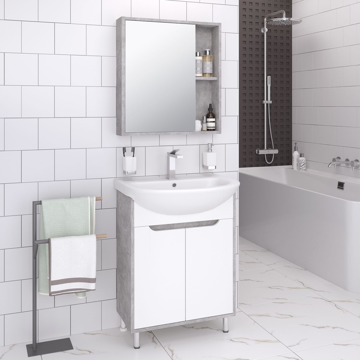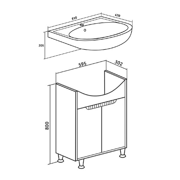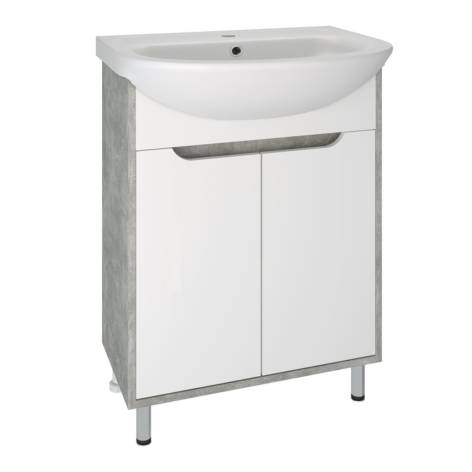 Тумба с раковиной RUNO ЭКО - превосходное решение для современного оснащения ванной комнаты. Тумба под раковину ЭКО (напольная) это стильное сочетание текстуры серого необработанного бетона на корпусе с белыми фасадами из ДСП. Тумба в ванную имеет две распашные дверцы и одну внутреннюю полку. В комплекте идут петли, 2 хромированные и 2 пластиковые ножки. Тумба для ванной комплектуется керамической раковиной "УЮТ" (610*470 мм). Раковина имеет глубину 21 см. Мебель для ванной RUNO - красота и практичность в мелочах!