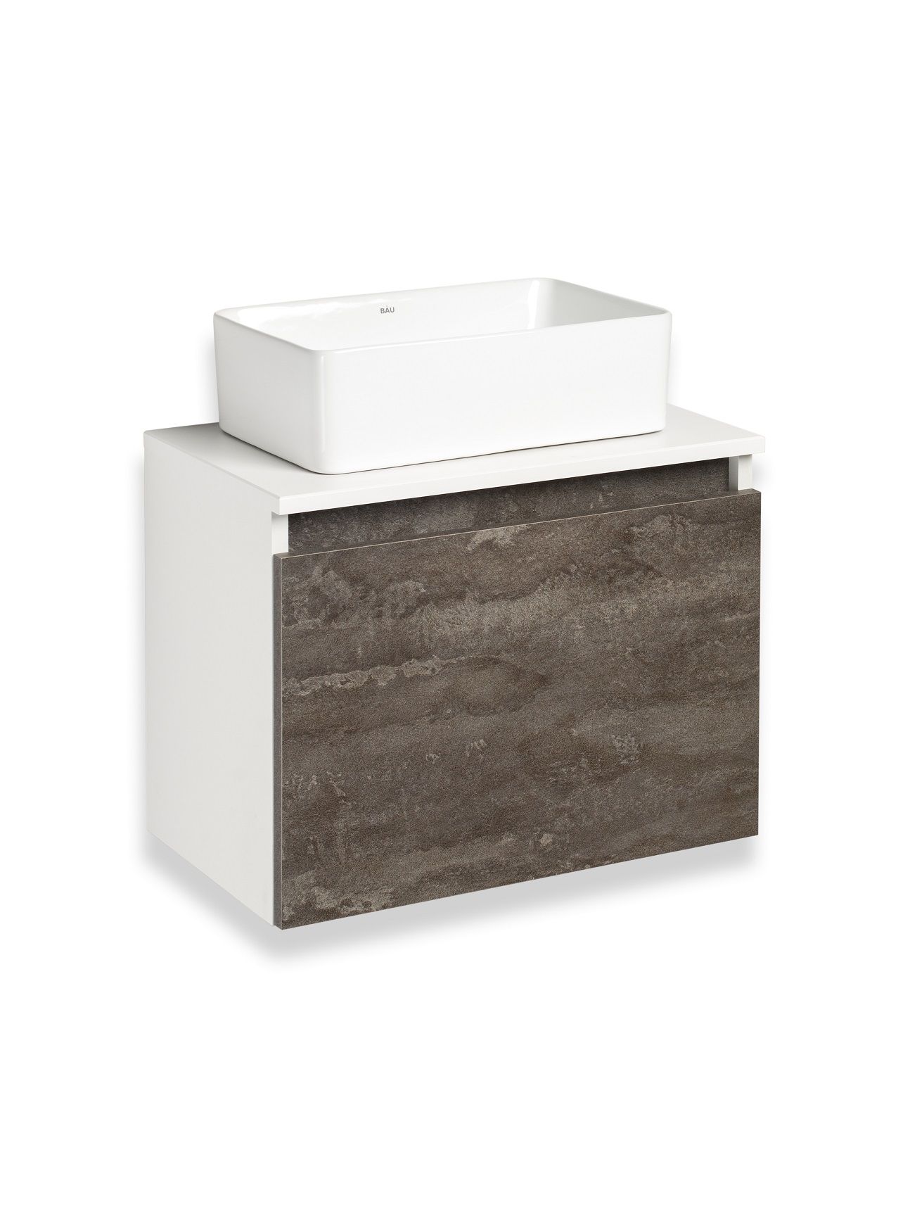 Тумба под раковину в ванную RUNO БАРИ (подвесная) - безупречное сочетание модных тенденций с классическим оформлением ванной комнаты. Тумба под раковину БАРИ оснащена выдвижным ящиком на шариковых направляющих, с системой плавного закрывания. Цвет корпуса классический - белый, при этом цвет фасада в модном цвете – железный камень, идеально впишутся в любой интерьер ванной комнаты. К тумбе для ванной подойдут умывальники на столешницу: «UNO 24» (24х24см) – очень маленькая модель, идеально подходит для ограниченного пространства в небольших помещениях. Строгая квадратная геометрически правильная форма раковины, усиливает идею лаконичности в дизайне, устанавливается на столешницу, накладным методом. «DUE 38» (38х24см) – маленькая модель, идеально подходит для ограниченного пространства в небольших помещениях. Строгая прямоугольная геометрически правильная форма раковины с округлыми углами, усиливает идею лаконичности в дизайне, устанавливается на столешницу, накладным методом.