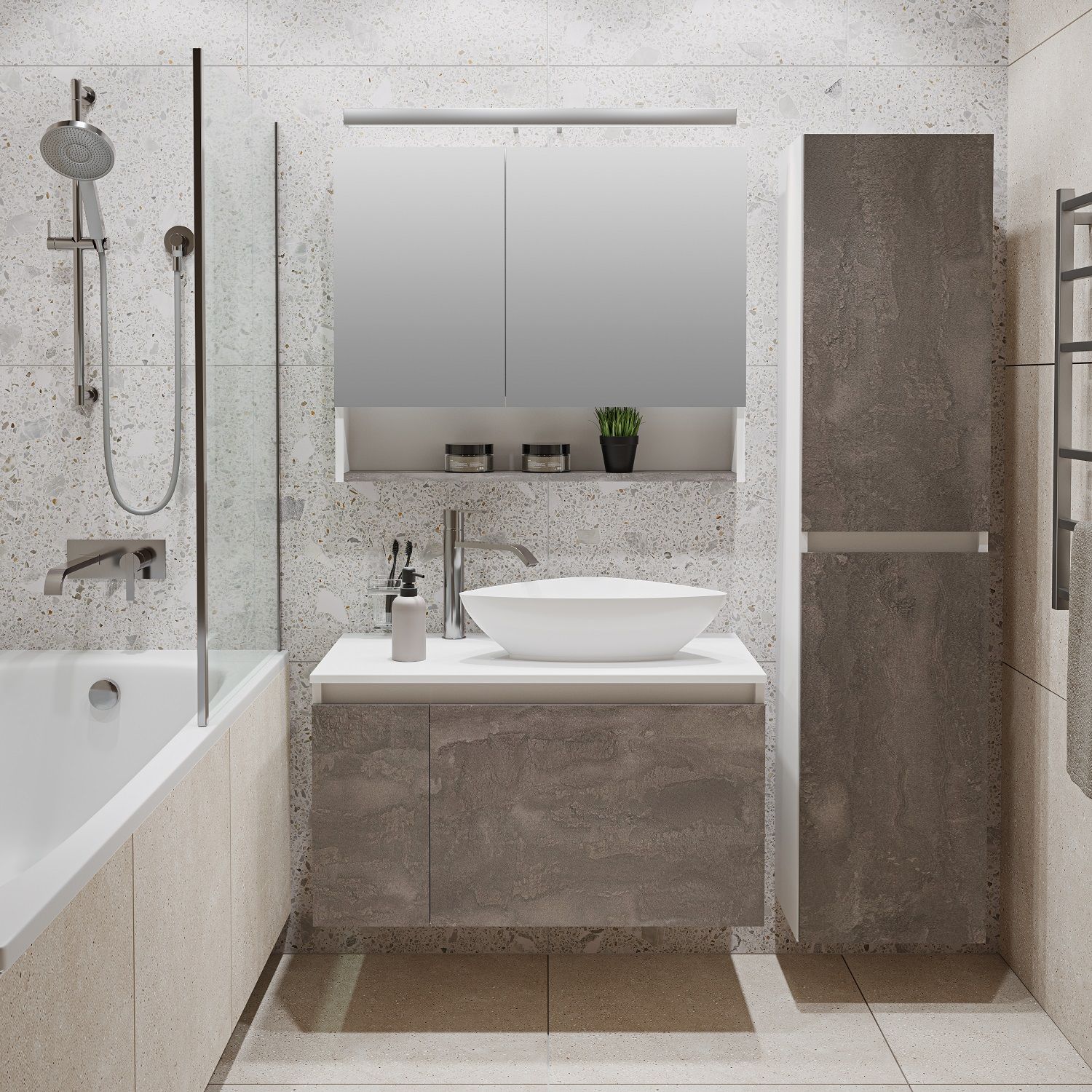Тумба под раковину в ванную RUNO БАРИ (подвесная) - безупречное сочетание модных тенденций с классическим оформлением ванной комнаты. Тумба под раковину БАРИ оснащена выдвижным ящиком на шариковых направляющих, с системой плавного закрывания с правой стороны и распашной дверцей с левой стороны, дверца укомплектована двумя петлями верхняя с доводчиком, нижняя без доводчика. Цвет корпуса классический - белый, при этом цвет фасада в модном цвете – железный камень, идеально впишутся в любой интерьер ванной комнаты. К тумбе для ванной подойдут умывальники на столешницу: «OVALE 50» (50х36см) - идеальное решение для стильного интерьера ванной, создан для минималистичных интерьеров и подойдёт для санузлов в стиле лофт, минимализм и хай-тек. Строгая овальная геометрически правильная форма раковины, усиливает идею лаконичности в дизайне, устанавливается на столешницу, накладным методом. «PALLA D41» (диаметр 41см) - идеальное решение для стильного интерьера ванной, создан для минималистичных интерьеров и подойдёт для санузлов в стиле лофт, минимализм и хай-тек. Строгая круглая геометрически правильная форма раковины, усиливает идею лаконичности в дизайне, устанавливается на столешницу, накладным методом. «TRE 48» (48х37см) - идеальное решение для стильного интерьера ванной, создан для минималистичных интерьеров и подойдёт для санузлов в стиле лофт, минимализм и Хай-Тек. Строгая прямоугольная форма с округлыми углами усиливает идею лаконичности в дизайне, устанавливается на столешницу, накладным методом. «TERZO 60» (59х39см) - идеальное решение для стильного интерьера ванной, создан для минималистичных интерьеров и подойдёт для санузлов в стиле лофт, минимализм и хай-тек. Асимметричная раковина, которую можно установить любой стороной, дизайнерское решение для нестандартных интерьеров, усиливает идею лаконичности в дизайне, устанавливается на столешницу, накладным методом.