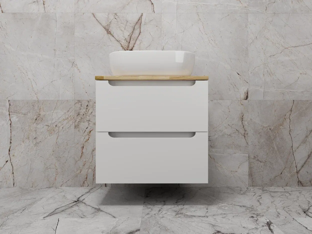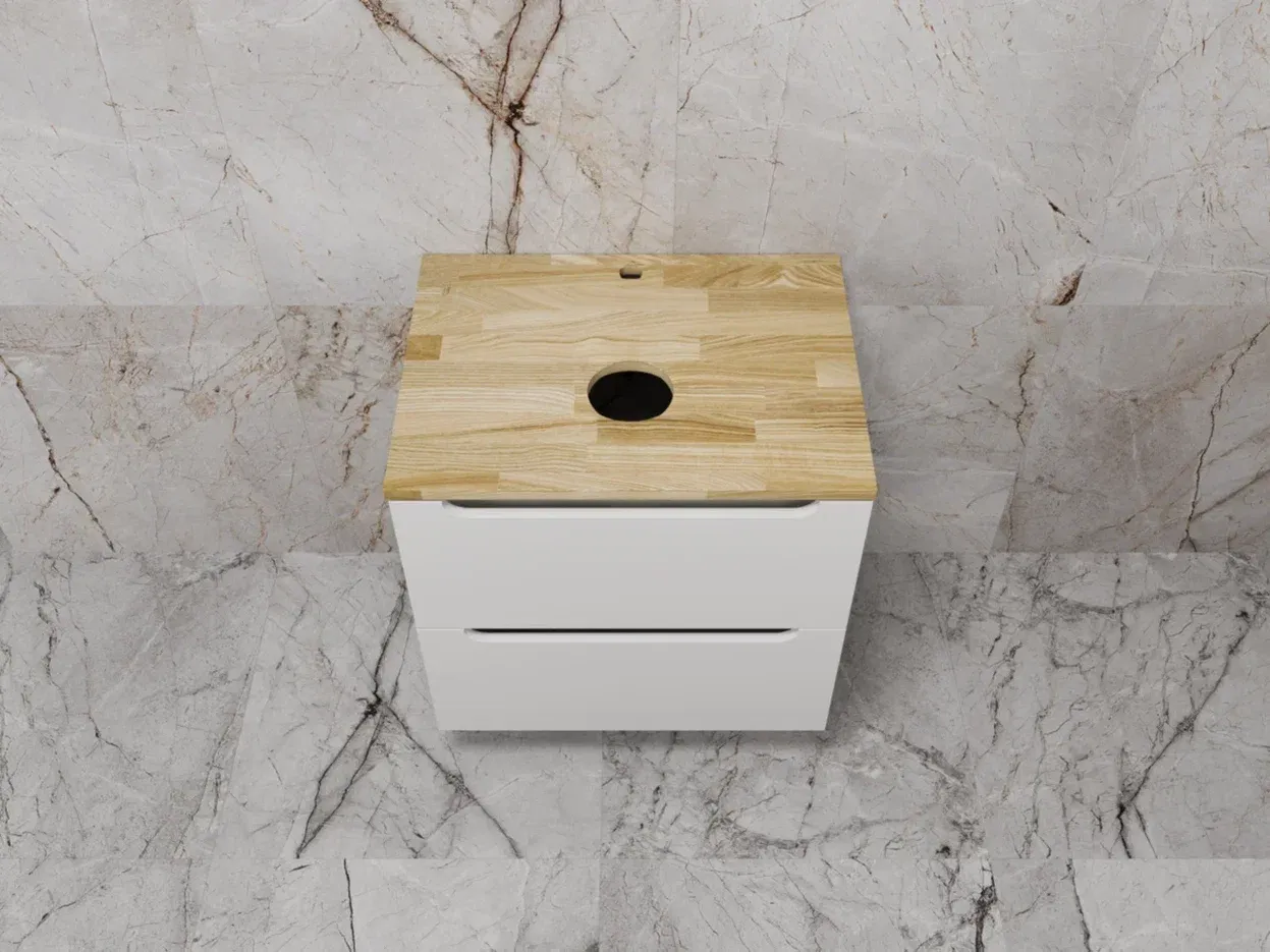 Столешница из натурального ясеня толщиной 20 мм покрыта матовым влагостойким лаком. Фасады и корпус в матовой пленке SOFT TUOCH. Внутренне наполнение из ЛДСП в декоре ГРАФИТ с эргономичным ограничителем под сифон. Фасады без ручек с лаконичным вырезом для комфортного открывания. Выдвижные ящики с системой плавного закрывания SOFT CLOSE. Экологичные и влагостойкие материалы. Легкость в уходе, практичность и стильный внешний вид.