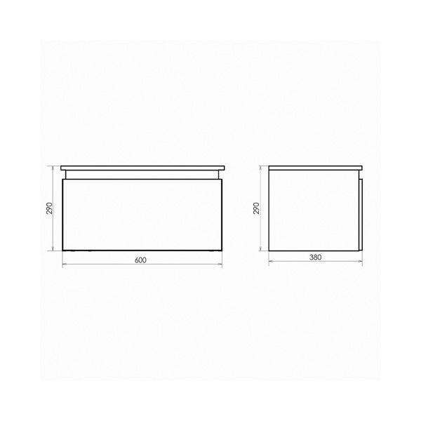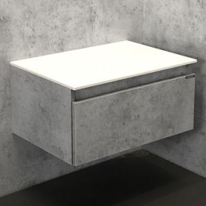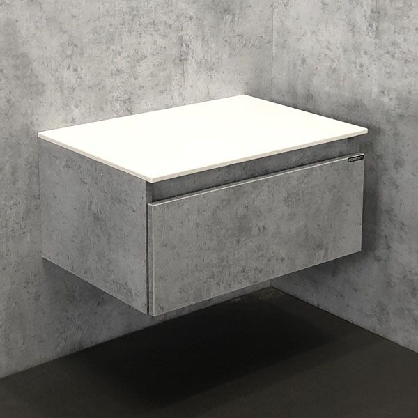 Подвесная тумба с одним выкатным ящиком. Направляющие ящика оборудованы механизмами плавного закрывания. Верхняя часть тумбы закрыта столешницей из белого керамогранита. Корпус и фасады из влагостойкого ЛДСП с декором "бетон светлый".