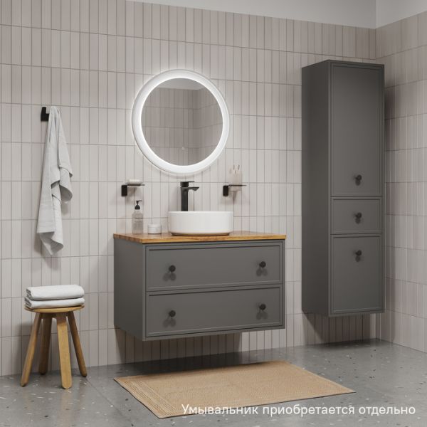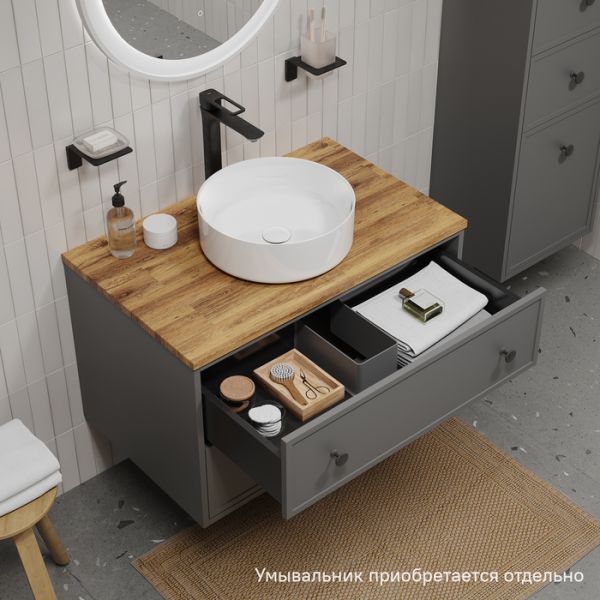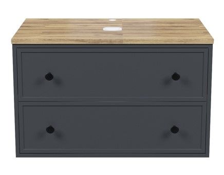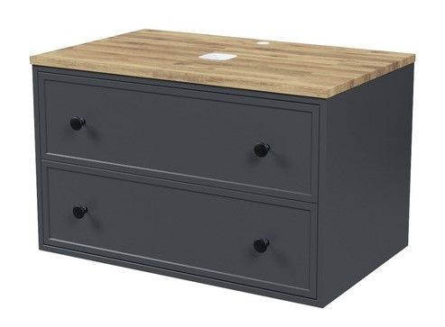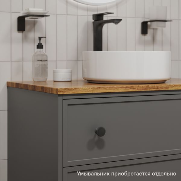 Вместительная подвесная тумба Torr трендового темно-серого цвета со столешницей из клееного натурального дуба. Сочетает в себе узнаваемый стиль и практичность популярного скандинавского дизайна. Ее четкие формы, теплый цвет дерева, фасады с декоративной филенкой, круглые ручки смотрятся гармонично и впишутся в любой современный интерьер. Подойдет любой накладной умывальник, покупается отдельно.
