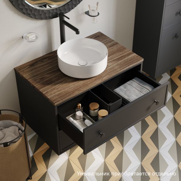Вместительная подвесная тумба Torr трендового темно-серого цвета со столешницей из МДФ в оттенке ореха макадамия. Сочетает в себе узнаваемый стиль и практичность популярного скандинавского дизайна. Ее четкие формы, теплый цвет дерева, фасады с декоративной филенкой, круглые ручки смотрятся гармонично и впишутся в любой современный интерьер. Подойдет любой накладной умывальник, покупается отдельно.