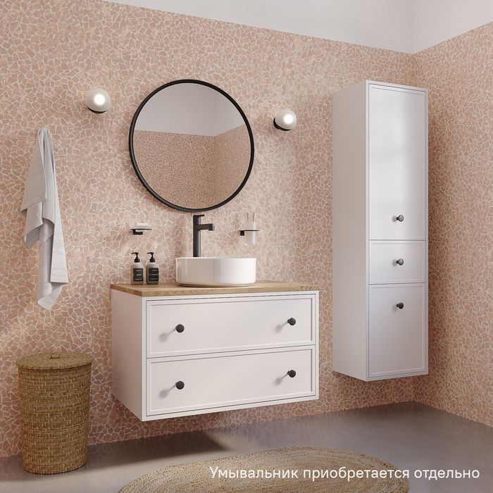 Вместительная подвесная тумба Torr классического молочно-белого цвета со столешницей из МДФ в оттенке дуба верона. Сочетает в себе узнаваемый стиль и практичность популярного скандинавского дизайна. Ее четкие формы, теплый цвет столешницы, фасады с декоративной филенкой, круглые ручки смотрятся гармонично и впишутся в любой современный интерьер. Подойдет любой накладной умывальник, покупается отдельно.