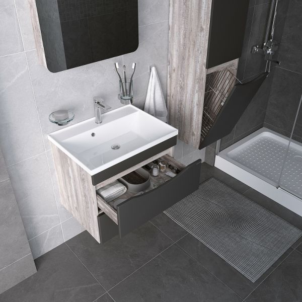 Тумба под раковину подвесная Талис-70 имеет два вместительных выдвижных ящика с врезными ручками в плоскости фасада. Ящики комплектуются шариковыми направляющими скрытого монтажа, с доводчиками. Корпус и фасады тумбы выполнены из влагостойких материалов, устойчивого к перепадам температуры и высокой влажности, крепится к стене и не занимает место на полу.Раковина Classika-70 приобретается отдельно.Цвет: бетон пайн, серый.