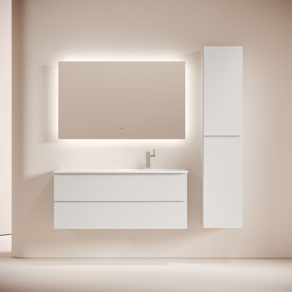 На изображении тумба Folk представлена с зеркалом Square 120 SQ120 и смесителем из коллекции Linn SC9019CH, раковиной Grace CN7021