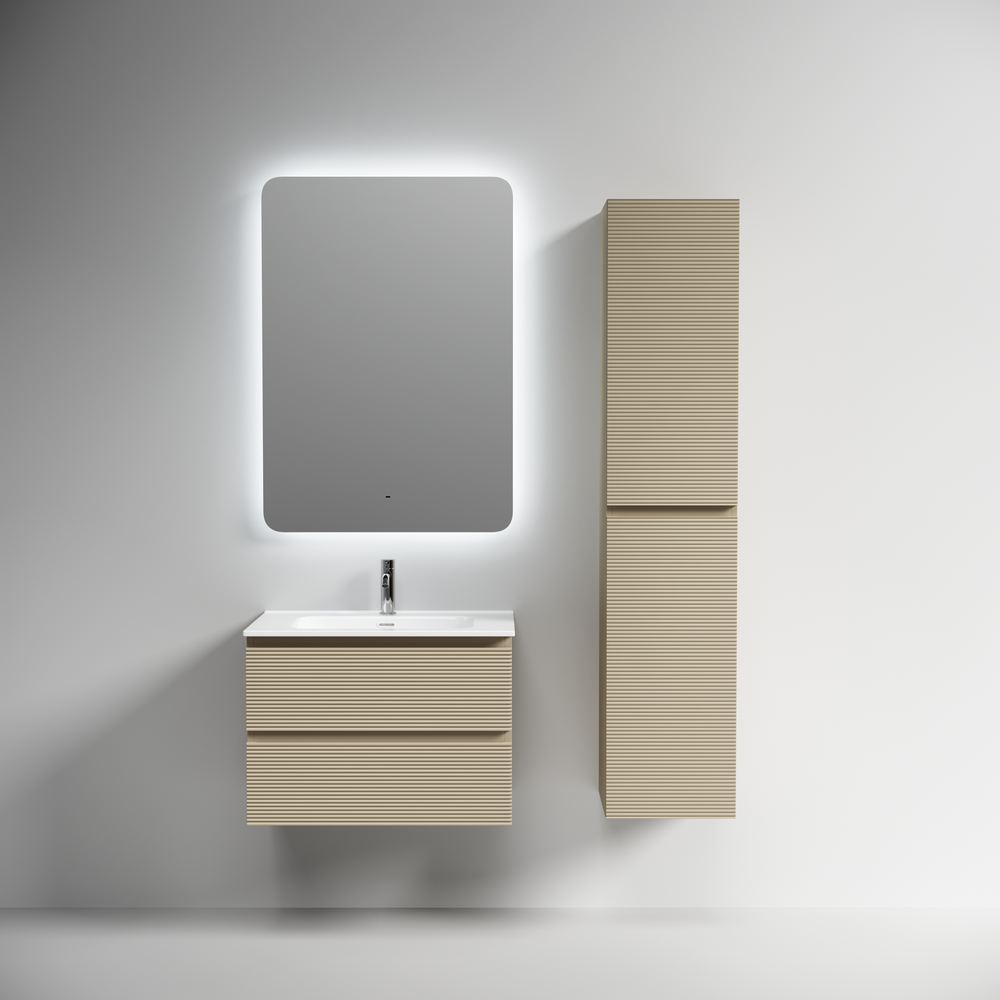 На изображении тумба Folk представлена с зеркалом RAY, смесителем из коллекции ETNA и раковинами Element CN7007